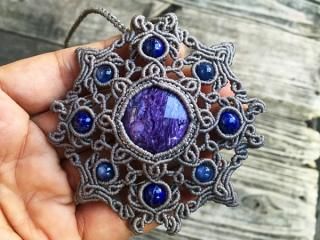 チャロアイト×カイヤナイト×ラピスラズリ マクラメ曼荼羅ネックレス113
