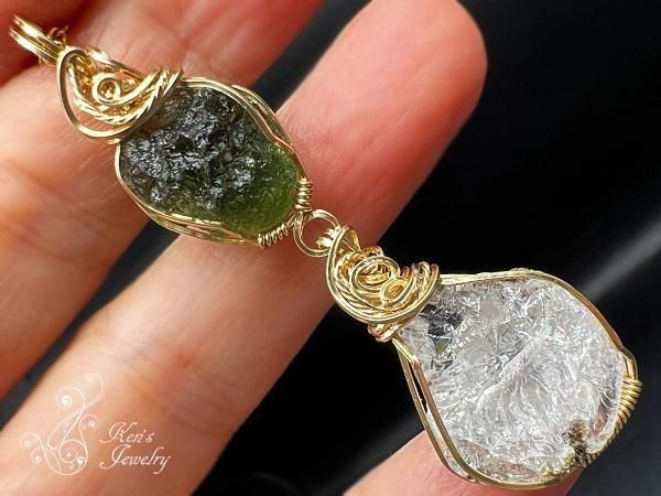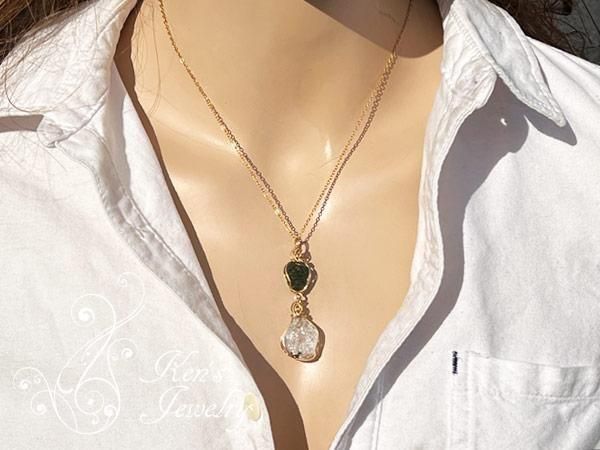 大変希少なモルダバイト原石と、大変希少性の高いロシア・マリシェヴォ鉱山産のフェナカイトを贅沢に組み合わせました。モルダバイトはコロンとした形状でほぼ欠けが無い高品質なモルダバイトです。フェナカイトは透明度が高く光が当たると虹があちらこちらに輝くとても綺麗な原石です。この組わせは非常に力強く存在感のある贅沢なネックレスで、持ち主様だけでなく周りの方にも幸せな気分を届けてくれる素敵なネックレスとなっています。